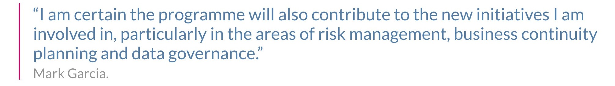 “I am certain the programme will also contribute to the new initiatives I am involved in, particularly in the areas of risk management, business continuity planning and data governance.”